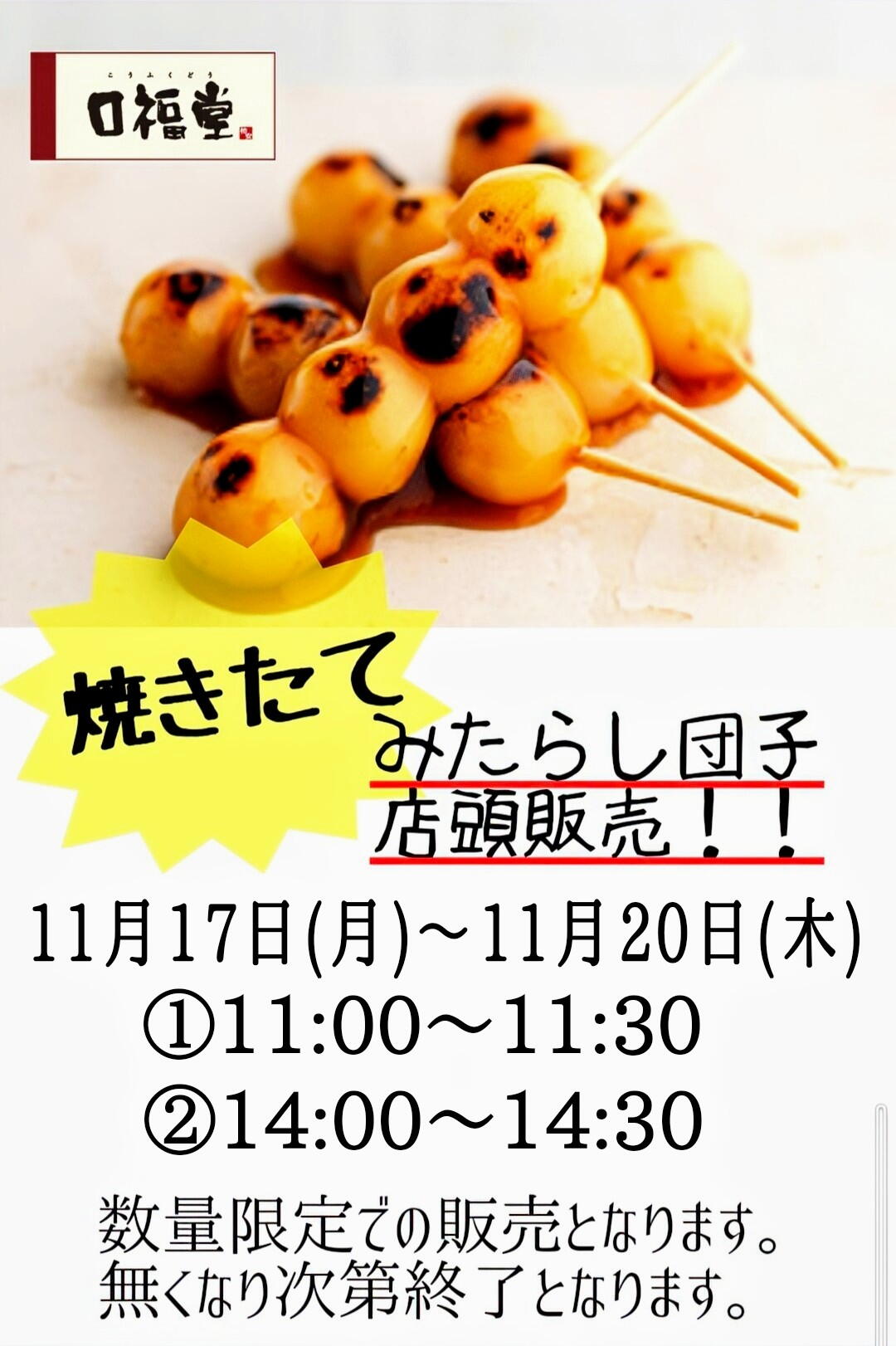 11/17(月)~11/20(木)の4日間限定で、口福堂店頭にて当店大人気商品“みたらし団子”の焼きたて!実演販売を行います。