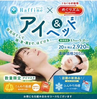 目の周りと耳をほぐした後に「めぐりズム」を付けて、リラックスしながら首・肩・頭をほぐすコースです。 今年は肩回りのストレッチが新たに加わり、よりスッキリ感を感じていただけます♪
