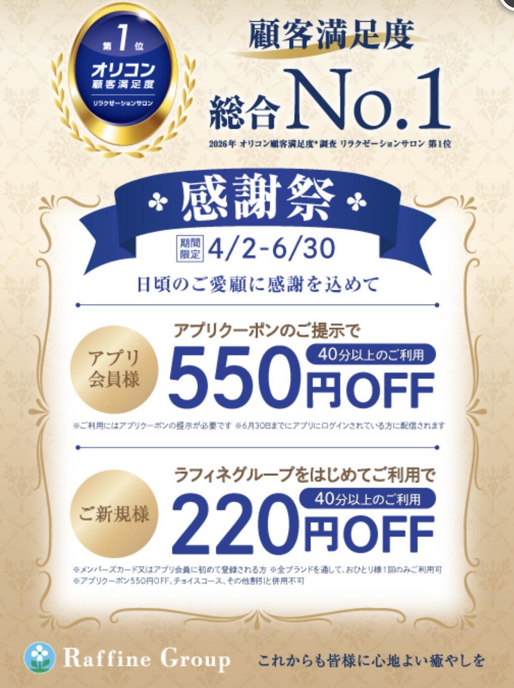 【ラフィネグループご新規のお客様限定】40分以上のコースご利用で税込220円オフ