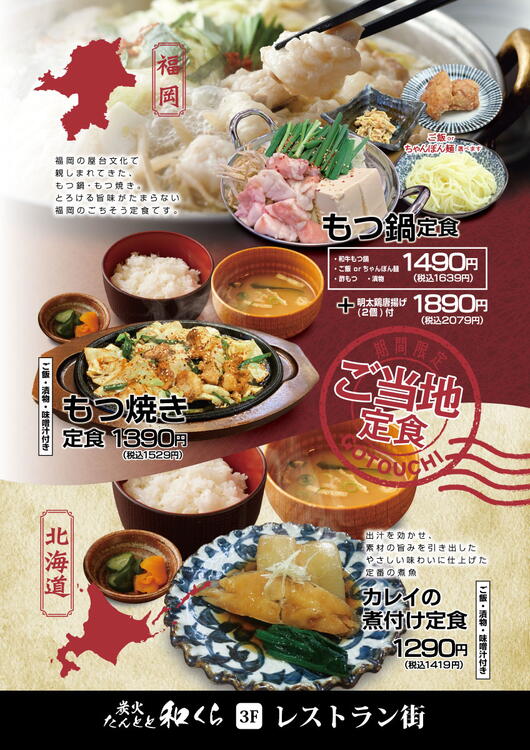 2月のご当地定食は【もつ鍋定食・もつ焼き定食・カレイの煮付け定食】
