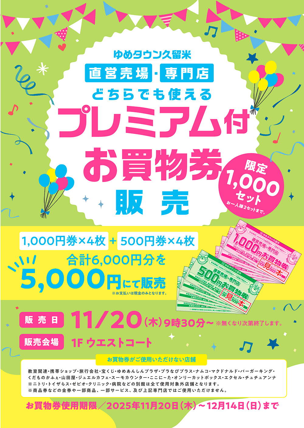 ゆめタウン久留米誕生祭を記念して、プレミアム付きお買物券販売を実施します。