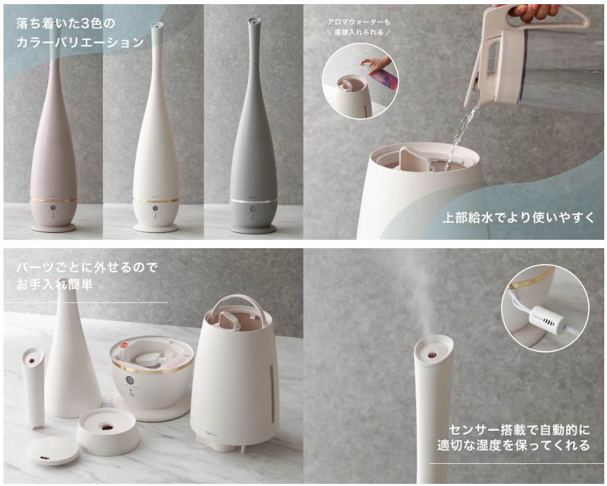 インテリアに溶け込む美しいデザインと、大容量タンクが魅力の 2WAY 超音波式加湿器です。