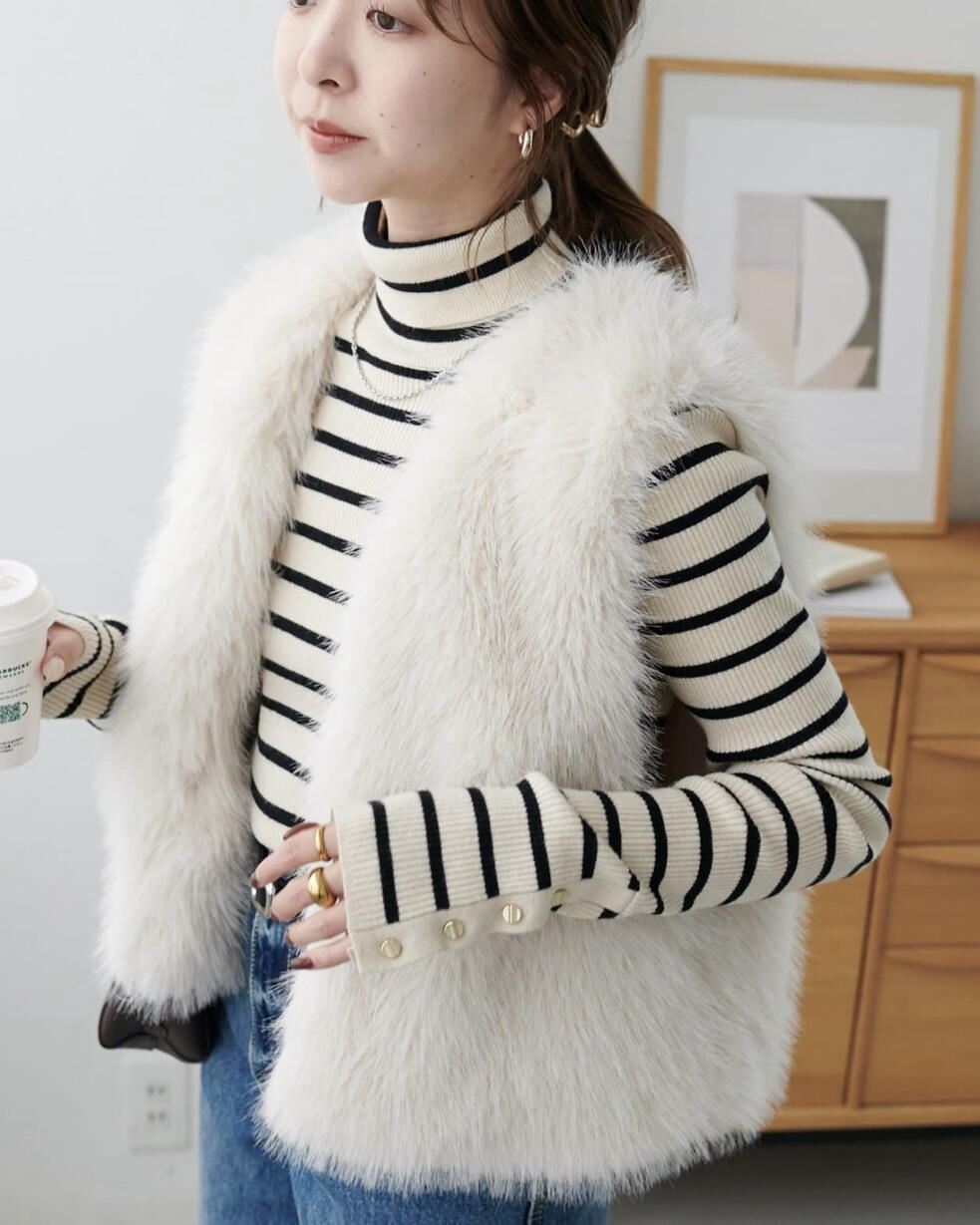 ふわふわで長い毛並みが上品で女性らしさ溢れるアイテムです。ショート丈でコーデのバランスがとりやすく、着回しやすいのもポイント◎