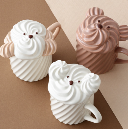 まるでホイップのデコレーションのような、いぬとくまの顔がキュートな遊び心のあるデザインのマグカップをご紹介します!