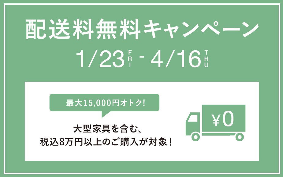 今回はキャンペーン期間中に家具を含む72,728円(税込80,000円)以上のお会計で配送料が無料となります。