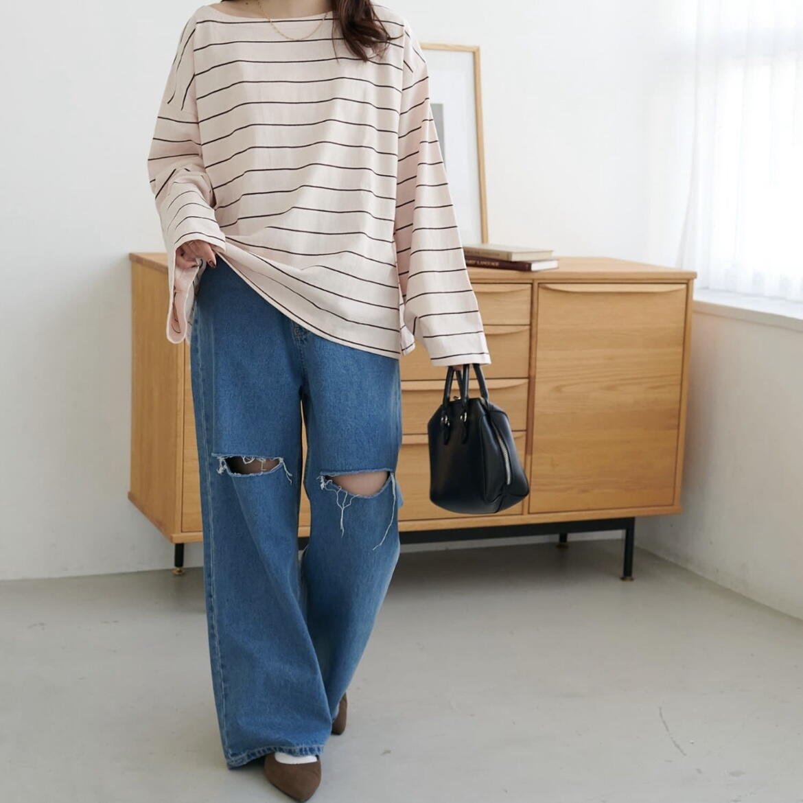 ゆったりサイズで体のラインを拾いにくくワイド袖がこなれ感をプラス◎細めのボーダーはカジュアルすぎず、大人見えを叶えます♪