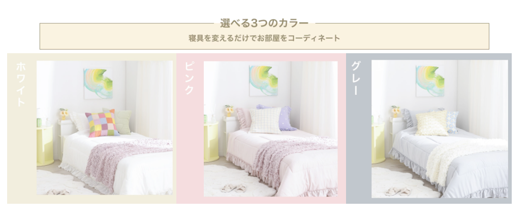 くすみカラーでどんなインテリアにも合わせやすく、フリルデザインはベッドコーディネートを華やかに彩ります。