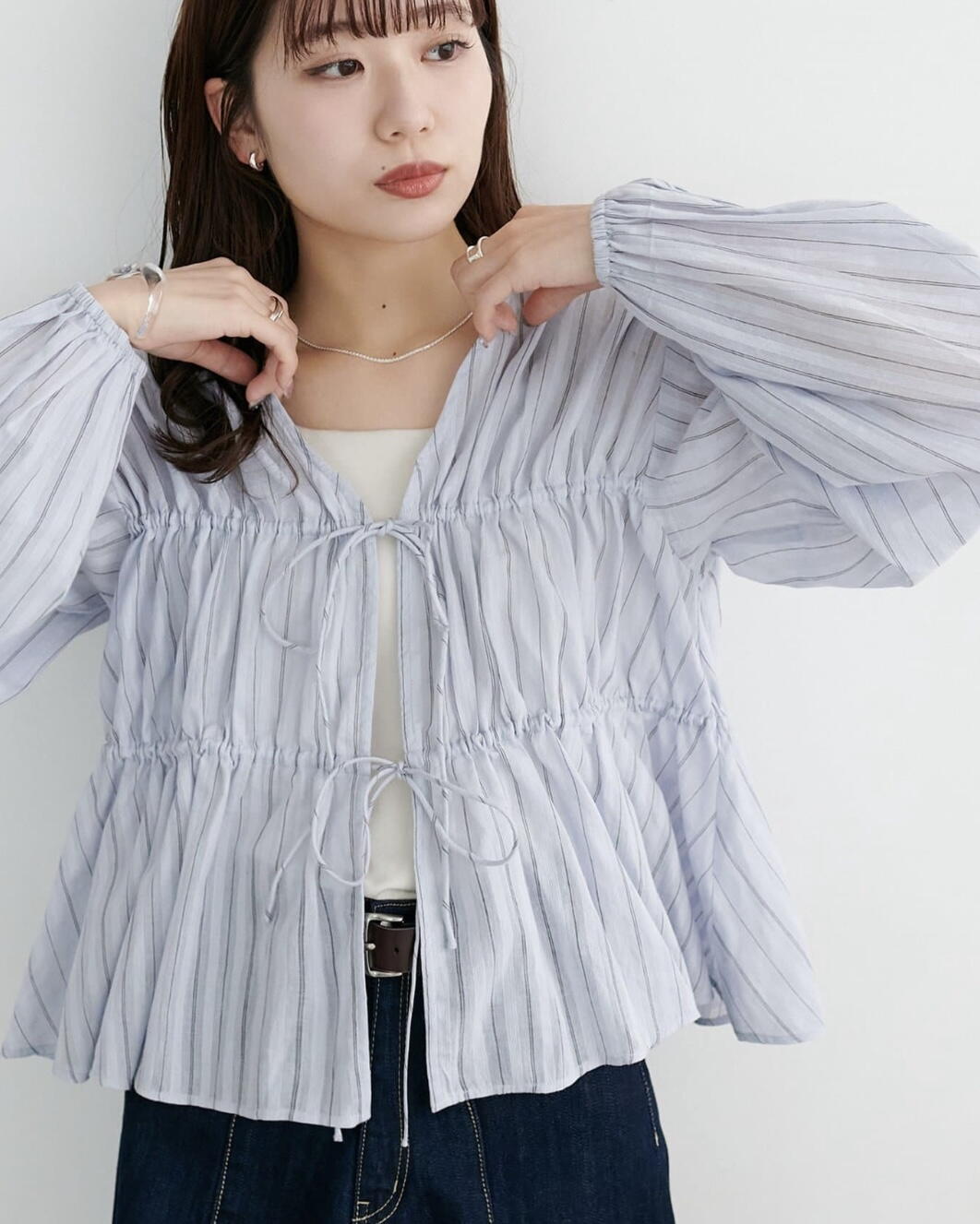 Vネック仕様ですっきりとした首元が甘くなりすぎす大人も挑戦しやすいリボンブラウスです♪