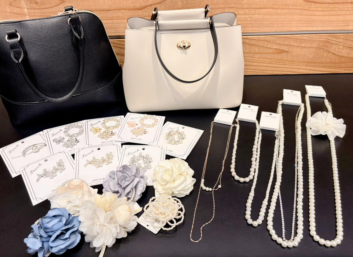 パールネックレスやコサージュ、ブローチ等の顔周りをさり気なく明るくするアクセサリーや、バッグ、スーツに合わせて上品に履けるスリッパ等も揃えております。