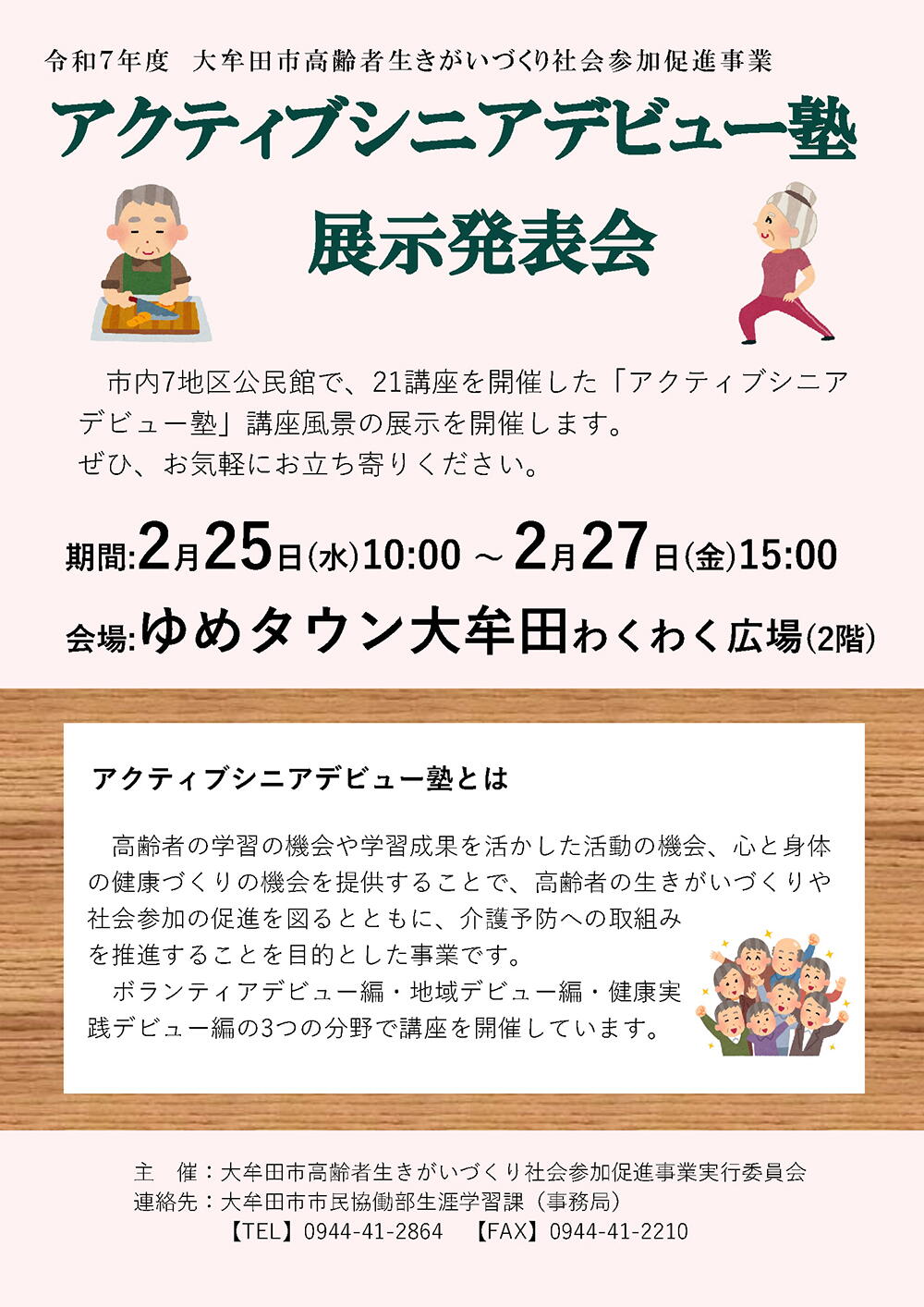 ・市内7地区公民館で、21 講座を開催した「アクティブシニアデビュー塾」講座風景の展示を開催します。