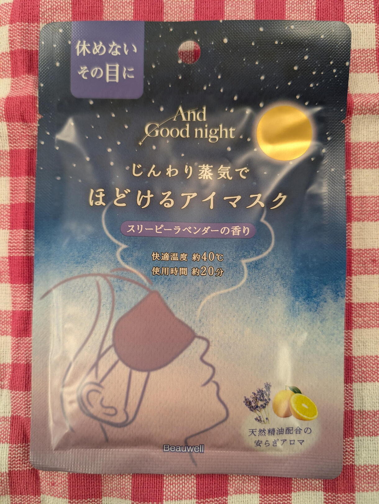 おやすみ前に、天然精油配合の安らぎアロマが香るじんわり蒸気で目と目元を温めます。