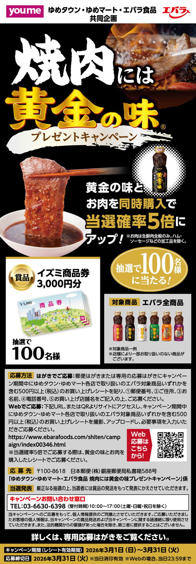 ゆめタウン・ゆめマート・エバラ食品 共同企画『焼肉には黄金の味(R)』プレゼントキャンペーン