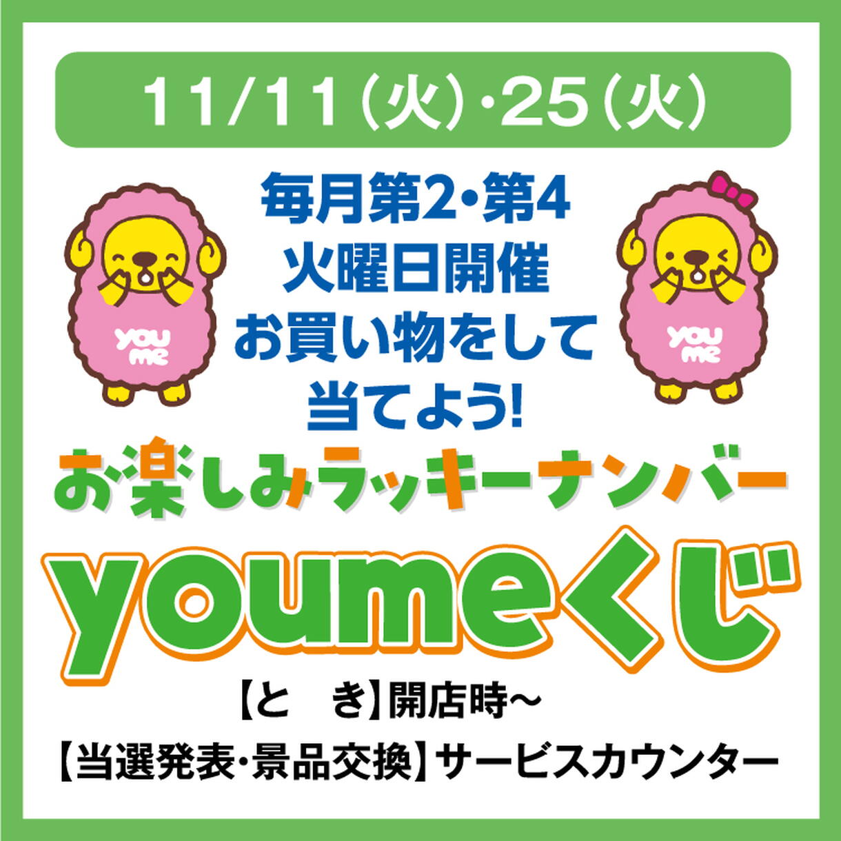 毎月第2・第4火曜日開催 お買い物をして当てよう! お楽しみラッキーナンバー youmeくじ