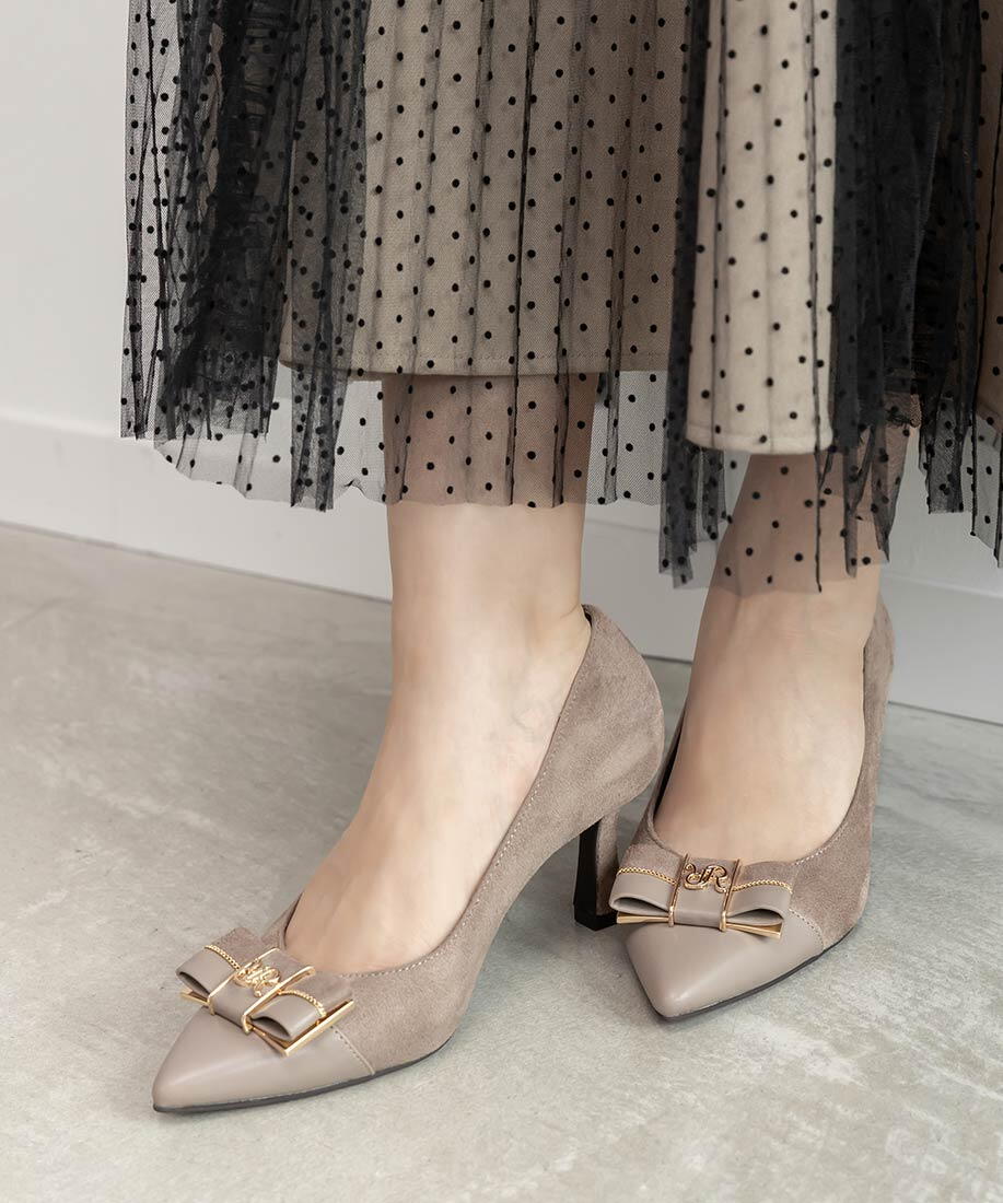 【走れる美脚パンプス】コンビマテリアルリボンフィットパンプス