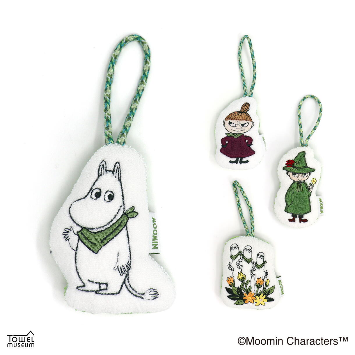 緑のスカーフを巻いたムーミン、リトルミイ、ニョロニョロ、スナフキンのぬいぐるみマスコットです。