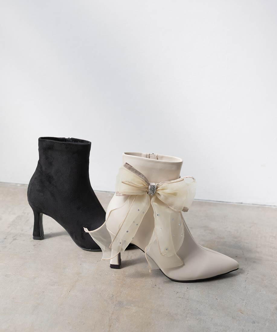 煌めくビジューxシアー素材のリボンが付いた2WAYショートブーツです!