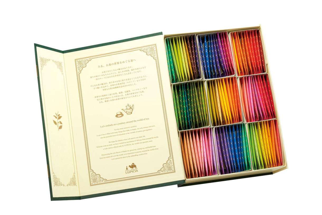 世界のお茶専門店「ルピシア」ならではの、個性豊かな紅茶、緑茶、烏龍茶、ハーブティーの中から厳選した100種のお茶をティーバッグで詰め合わせ。