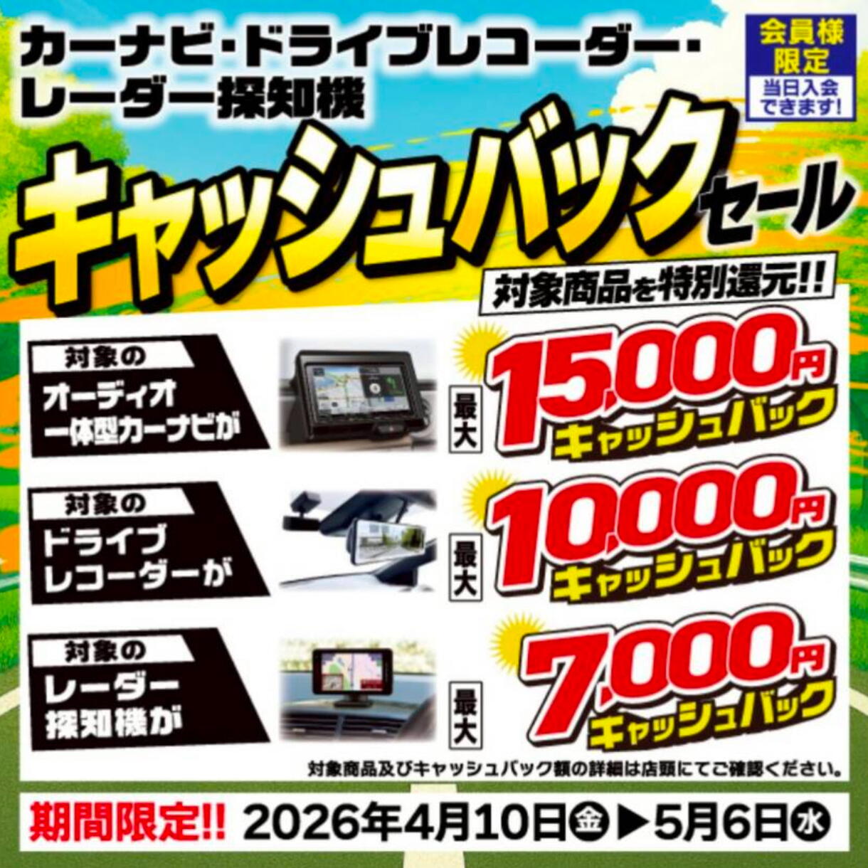 【会員さま限定】カーナビ・ドライブレコーダー・レーダー探知機キャッシュバックセール!