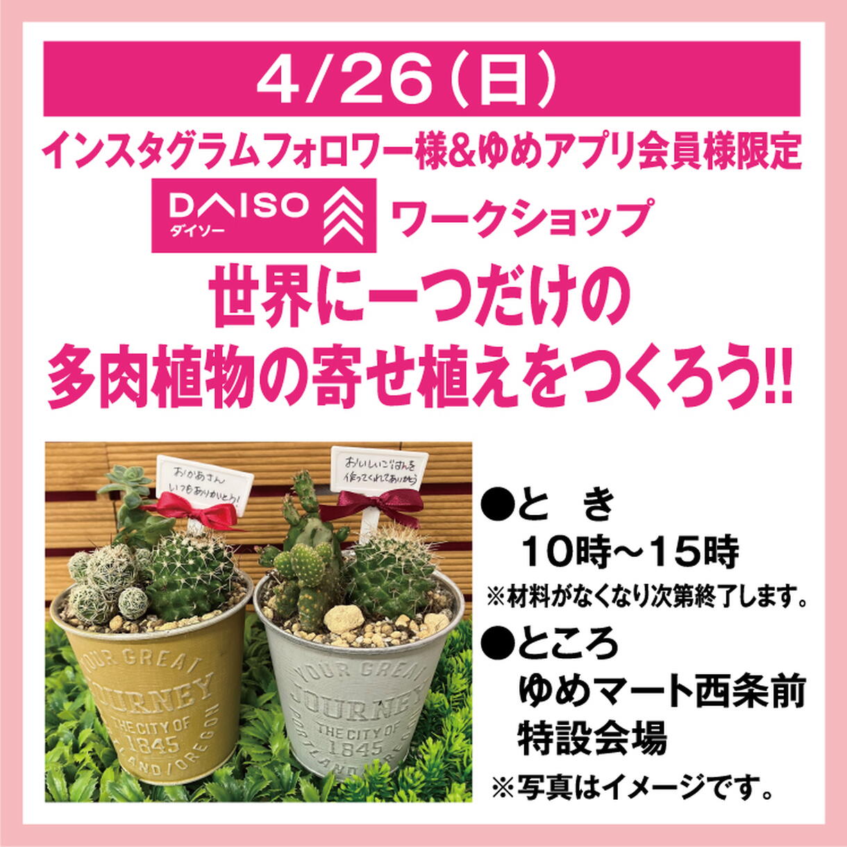 インスタグラムフォロワー様&ゆめアプリ会員様限定 DAISOワークショップ 世界に一つだけの多肉植物の寄せ植えをつくろう!!