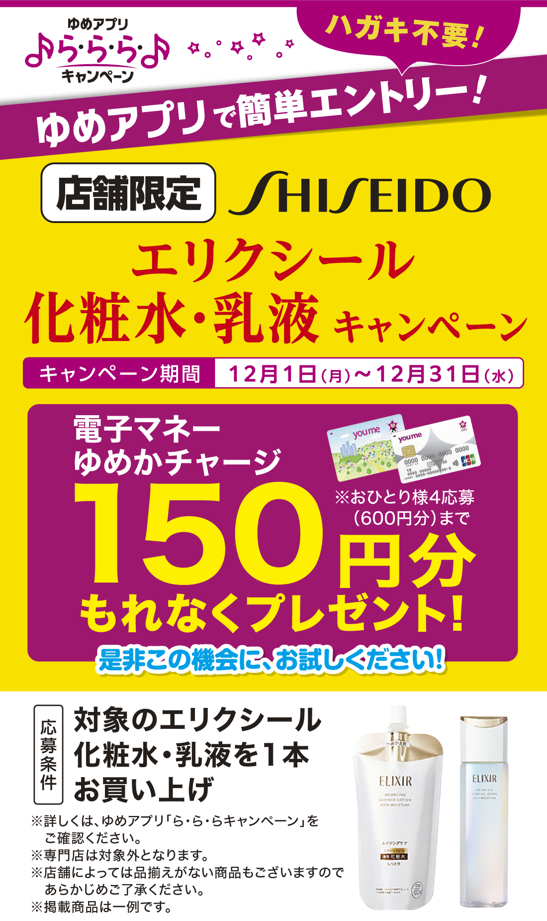 期間中、対象のエリクシール化粧水・乳液を1本お買い上げで、電子マネーゆめかチャージ150円分もれなくプレゼント!