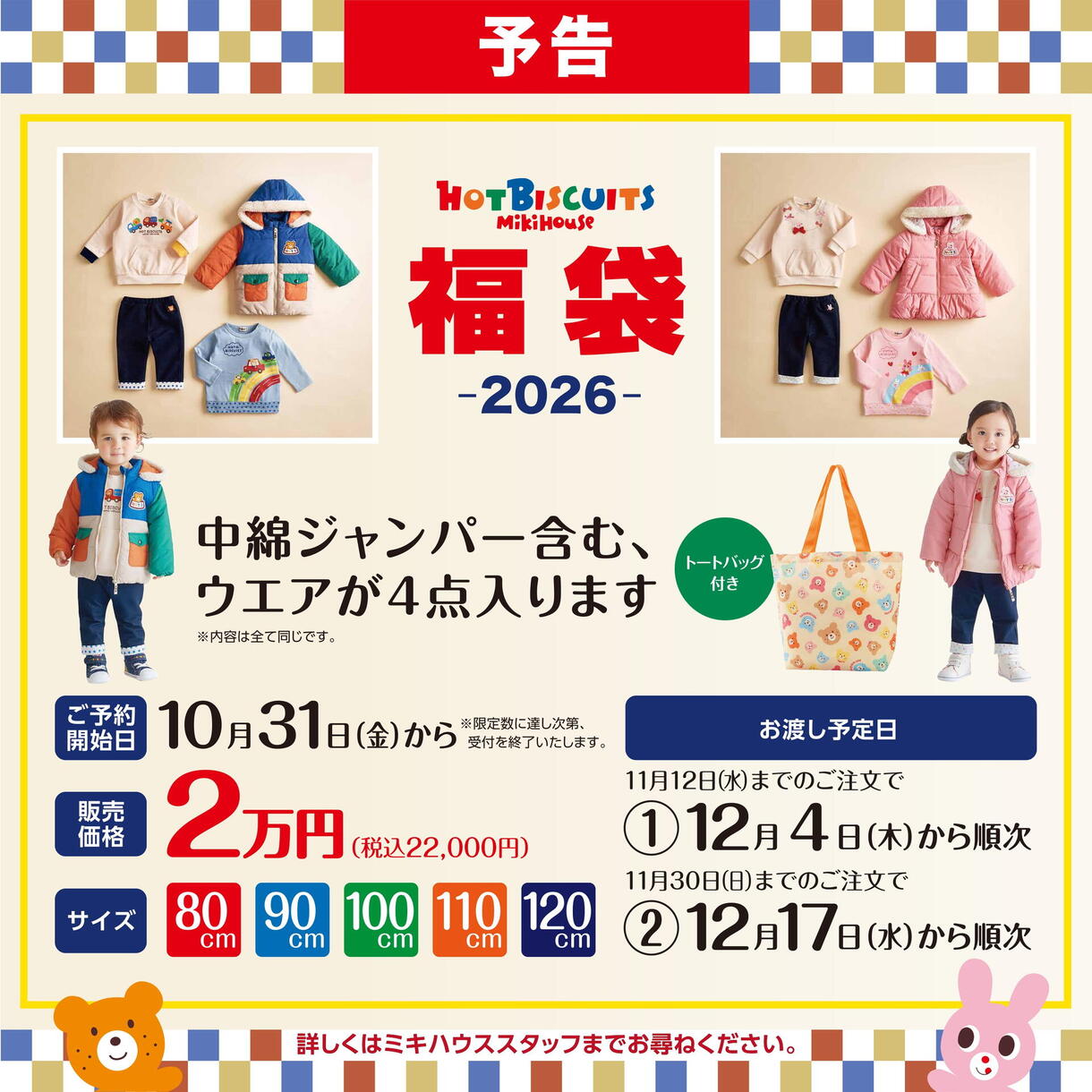 只今店頭にて2026年ミキハウス ホットビスケッツ福袋のご予約を承っております。