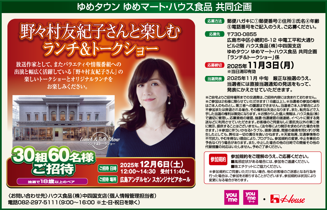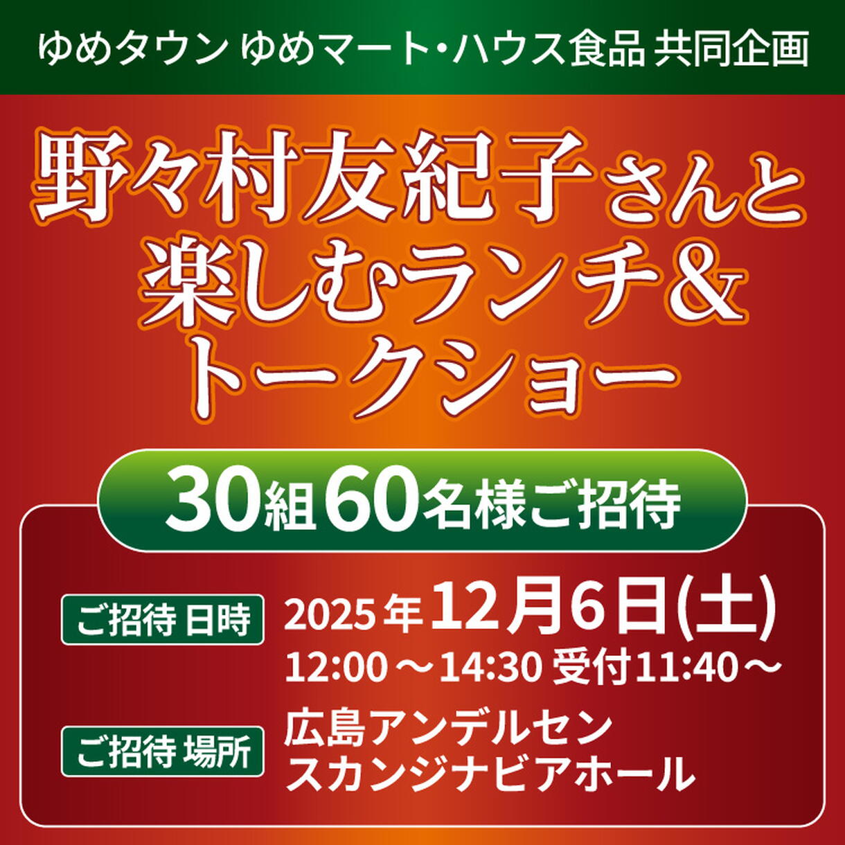 <ゆめタウン ゆめマート・ハウス食品共同企画>『野々村友紀子さんと楽しむランチ&トークショー』ご招待