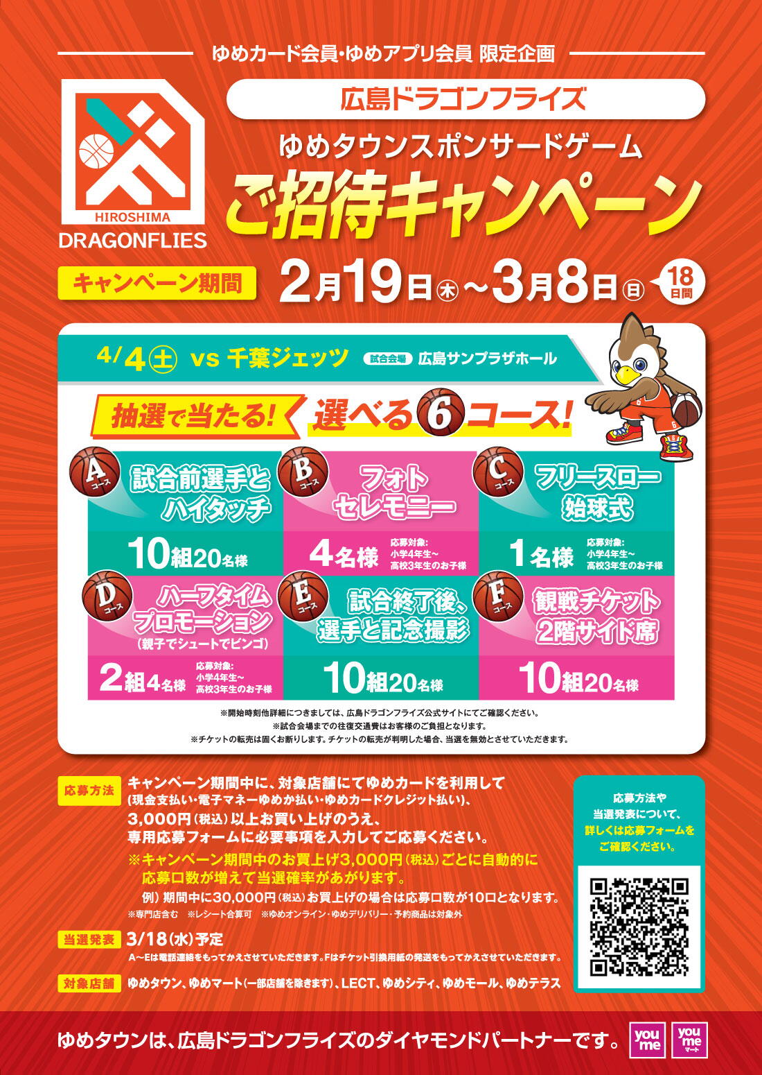 抽選で「広島ドラゴンフライズ」ゆめタウンスポンサードゲームにご招待します。