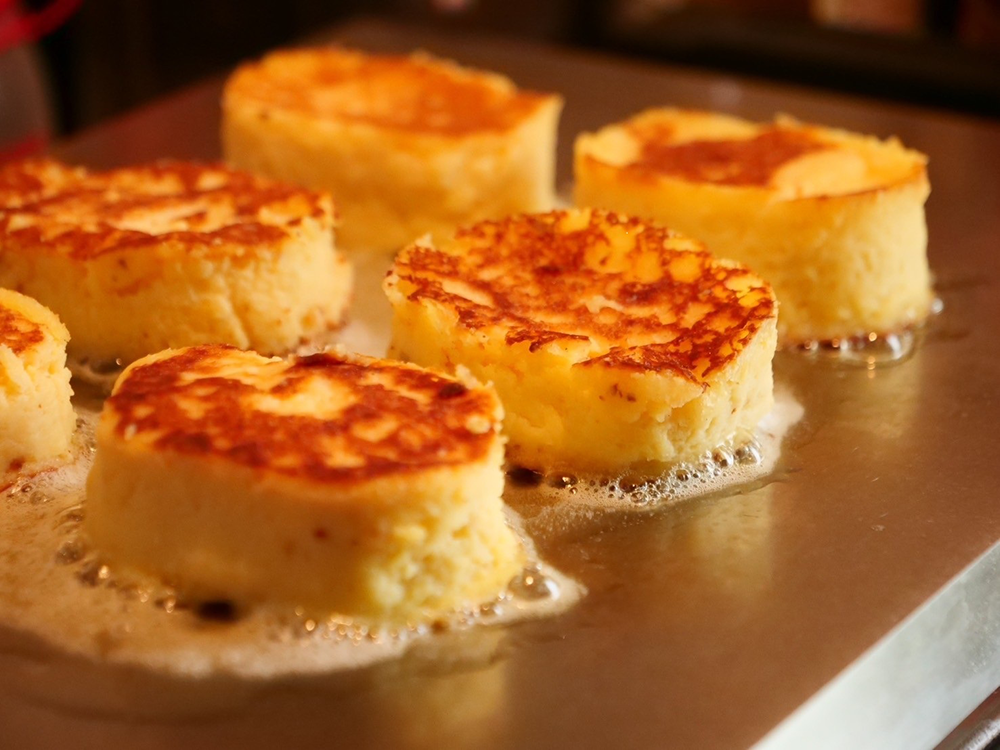 鉄板の上で一つ一つ丁寧に、お客様の目の前で焼き上げ、美味しさをそのままお届け。