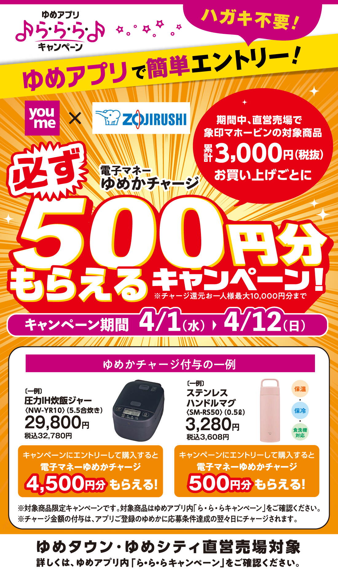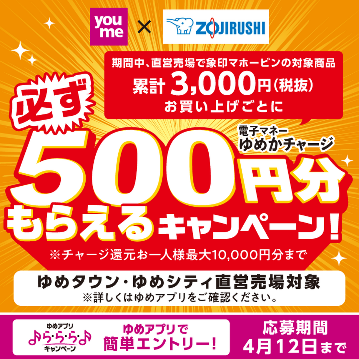 ゆめタウン高松 イベント/キャンペーン 【ゆめアプリ ら・ら・ら・キャンペーン】youme×ZOJIRUSHI『電子マネーゆめかチャージ必ず500円分もらえるキャンペーン』