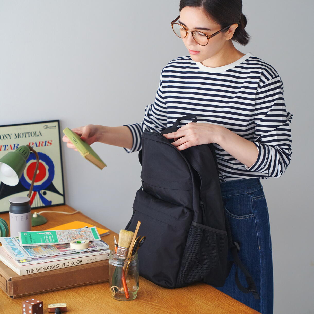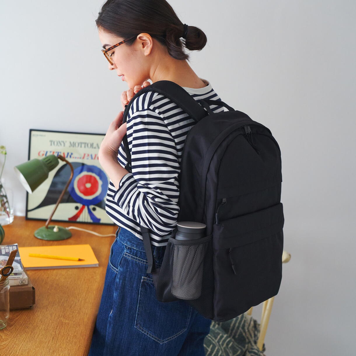 肩への負担を約43%軽減し、まるで無重力のような快適な使い心地が魅力です。リュック表面のポケットは定期などのさっと取り出したいアイテムが収納でき、両サイドのメッシュポケットはドリンクホルダーとしても使えます。はっ水加工を施したカジュアルな生地を使用しているので、気軽に使っていただけます。