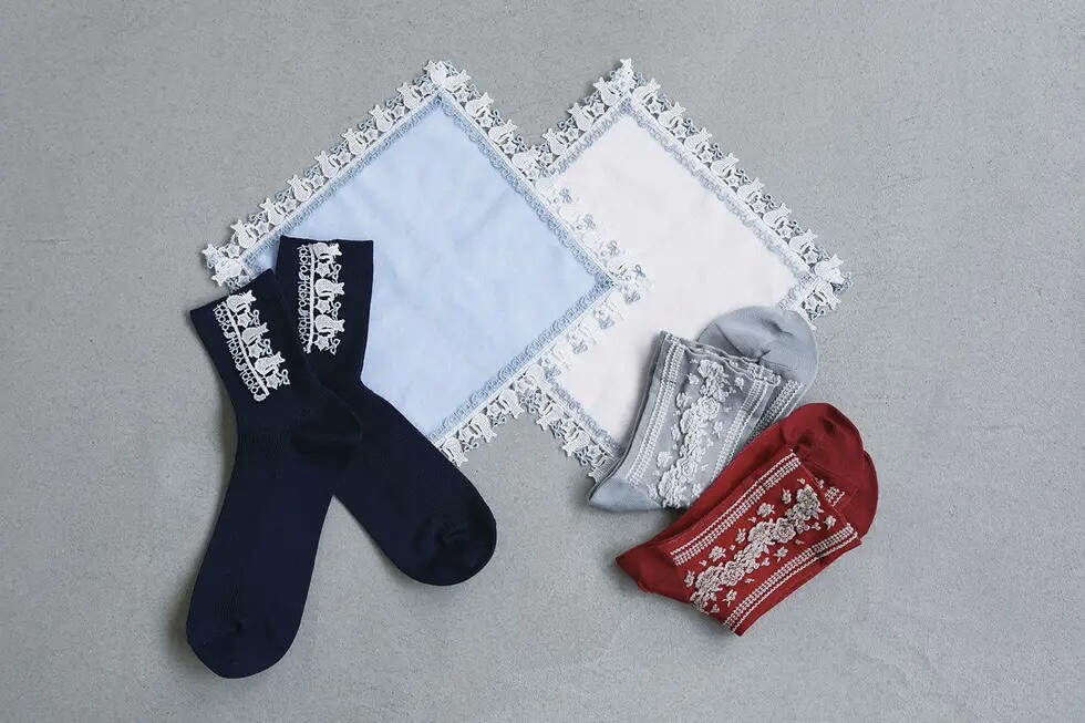 遊び心あふれる完全オリジナルのレースを使用した靴下とタオルハンカチ、そして近沢レース店人気のデザインを靴下で表現した特別な商品をご用意しました。
