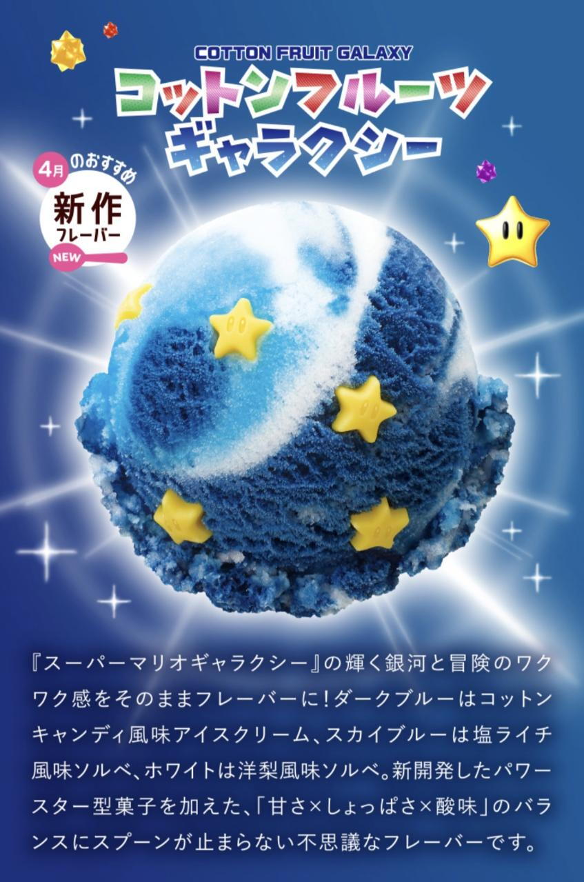 『スーパーマリオギャラクシー』の輝く銀河と冒険のワクワク感をイメージした新作フレーバー「コットンフルーツギャラクシー」をはじめ、今回のコラボキャンペーン限定のスペシャルダブルカップやサンデー、テイクアウトセットなど盛りだくさんのラインナップです!