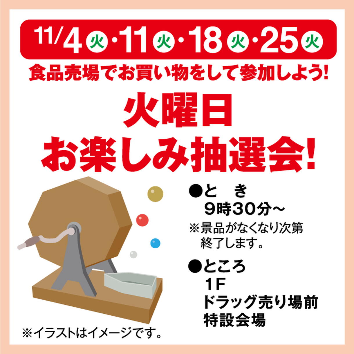 食品売場でお買い物をして参加しよう! 火曜日お楽しみ抽選会!