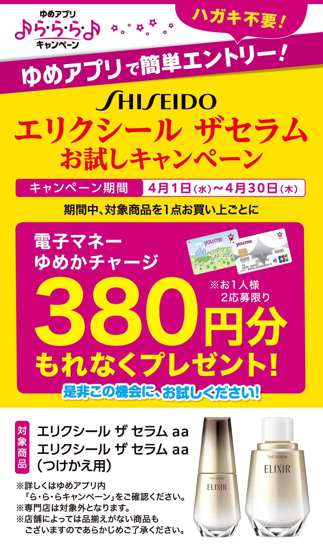 【ゆめアプリ ら・ら・ら・キャンペーン】資生堂『エリクシール ザセラムお試しキャンペーン』