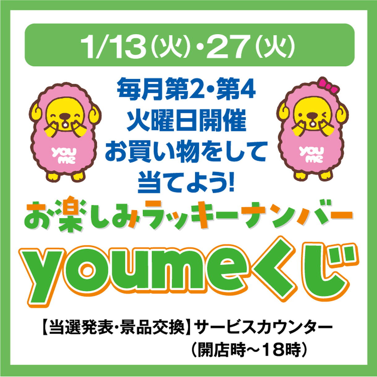 毎月第2・第4火曜日開催 お買い物をして当てよう! お楽しみラッキーナンバー youmeくじ