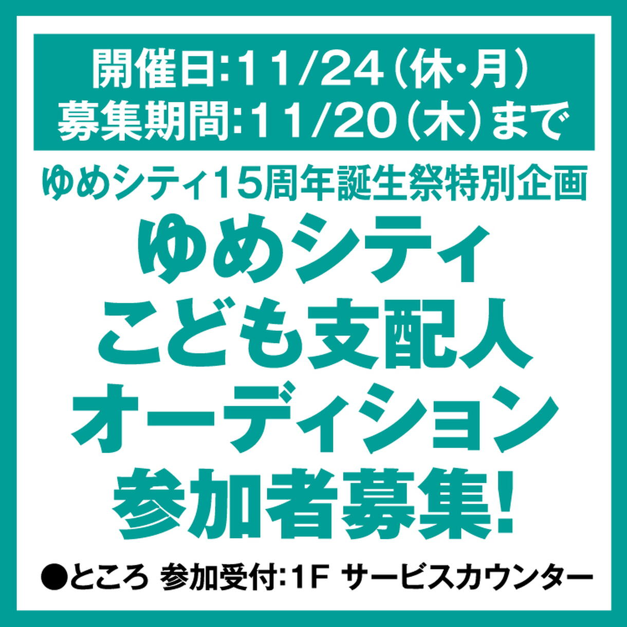 ゆめシティ15周年 誕生祭特別企画 ゆめシティこども支配人 オーディション参加者募集!