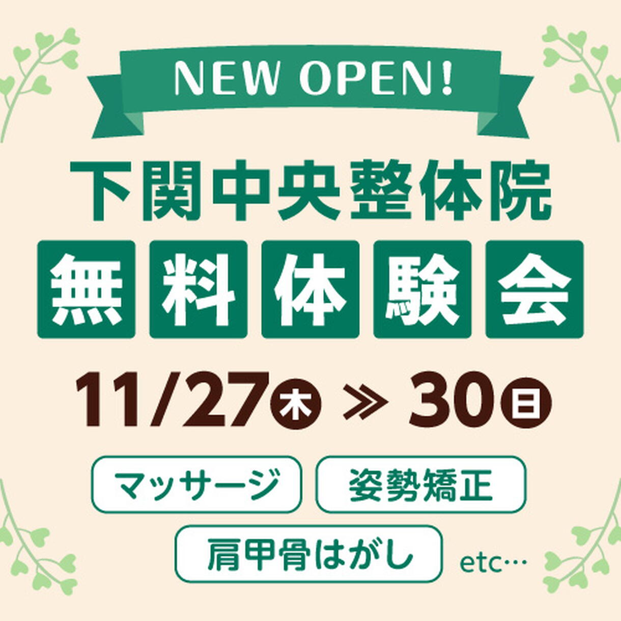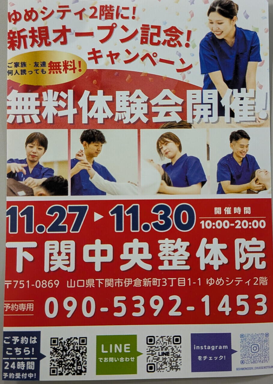 下関中央整体院 新規オープン記念 無料体験会開催