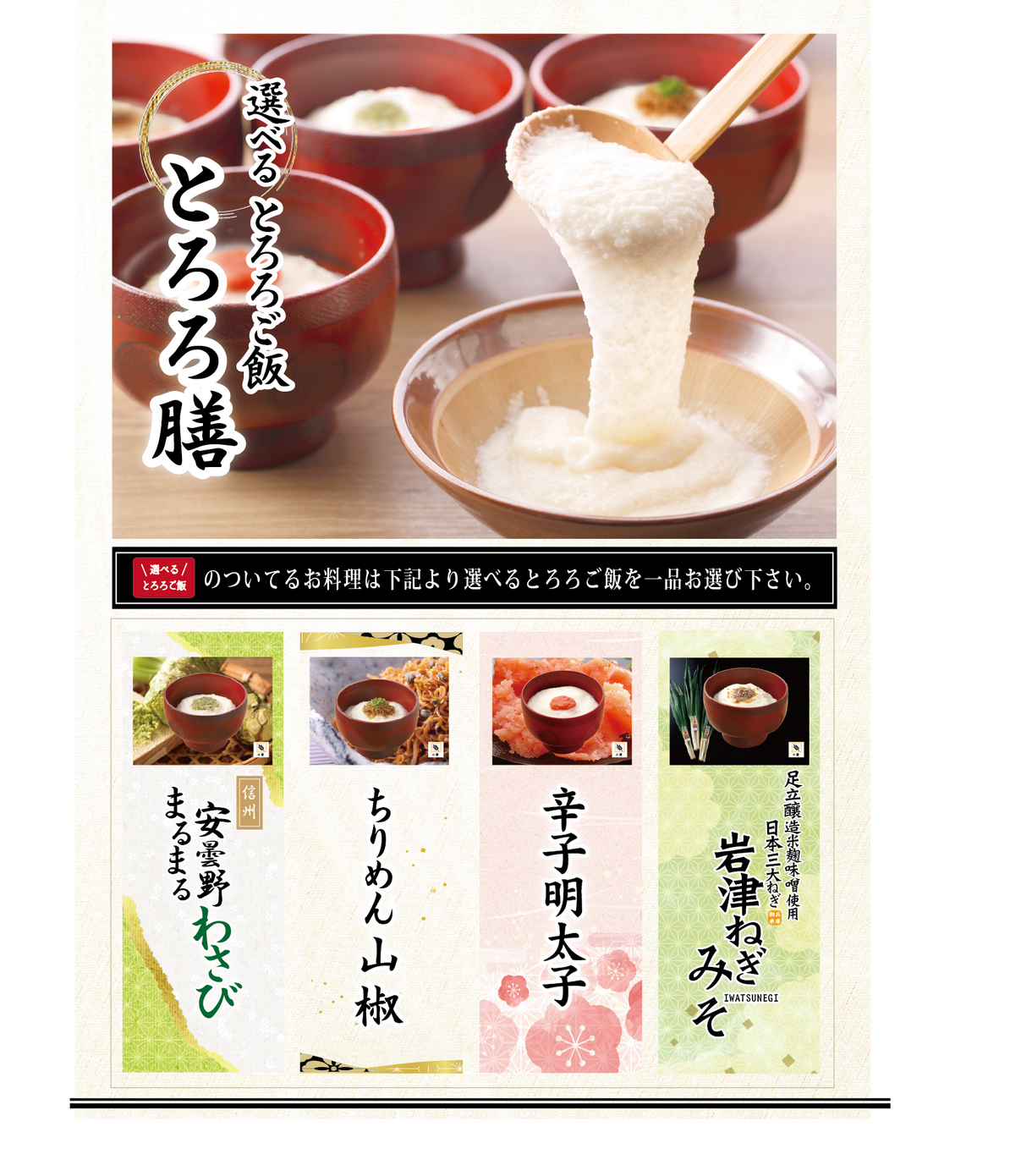 厳選した豚肉を使用したサクサクのとんかつと、栄養豊かなとろろを楽しめる和食膳のお店です。ロースかつ膳やヒレかつ膳、とろろ膳、海老フライ膳など多彩な定食をご用意しています。揚げたてのとんかつに、とろろを合わせた滋味深い味わいが魅力です。ごはん・キャベツはおかわり自由。お買い物の合間のお食事やご家族でのお食事にも、満足感あるひとときをお楽しみいただけます。