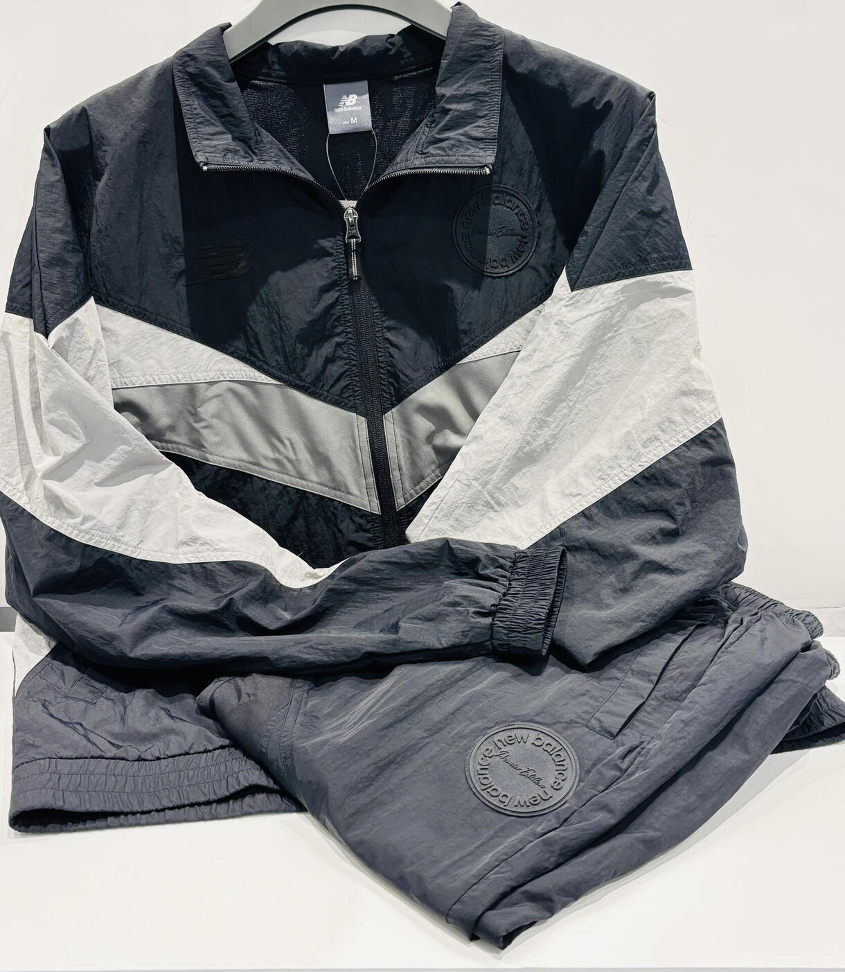 右腿にNBロゴ、左腿にサークルワッペン、シューズを履いたままでも脱ぎ穿きしやすい裾ファスナー付きです◎