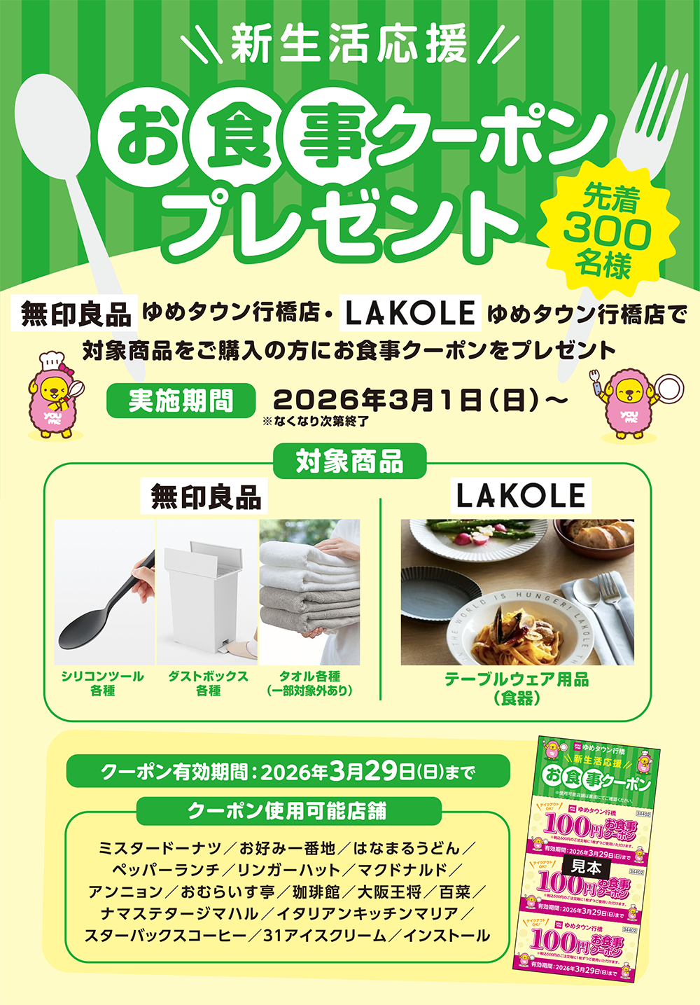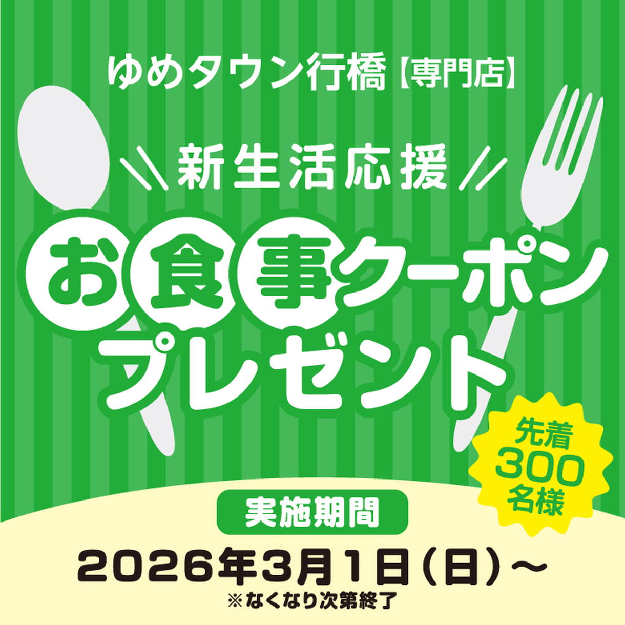 3/1(日)~ ゆめタウン行橋【新生活応援 お食事クーポンプレゼント】
