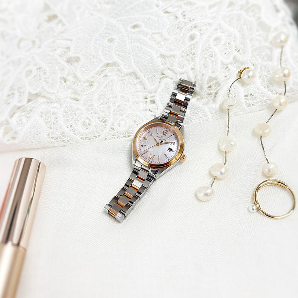 2時・10時位置には二粒の天然ダイヤモンドを設置。可愛らしさの中に上品なアクセントを添えています。