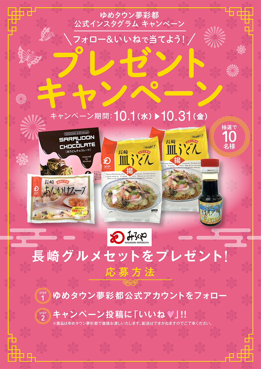 厳正なる抽選の上、キャンペーン終了後当選者様のみ ゆめタウン夢彩都公式アカウントからDMにてご案内させていただきます。