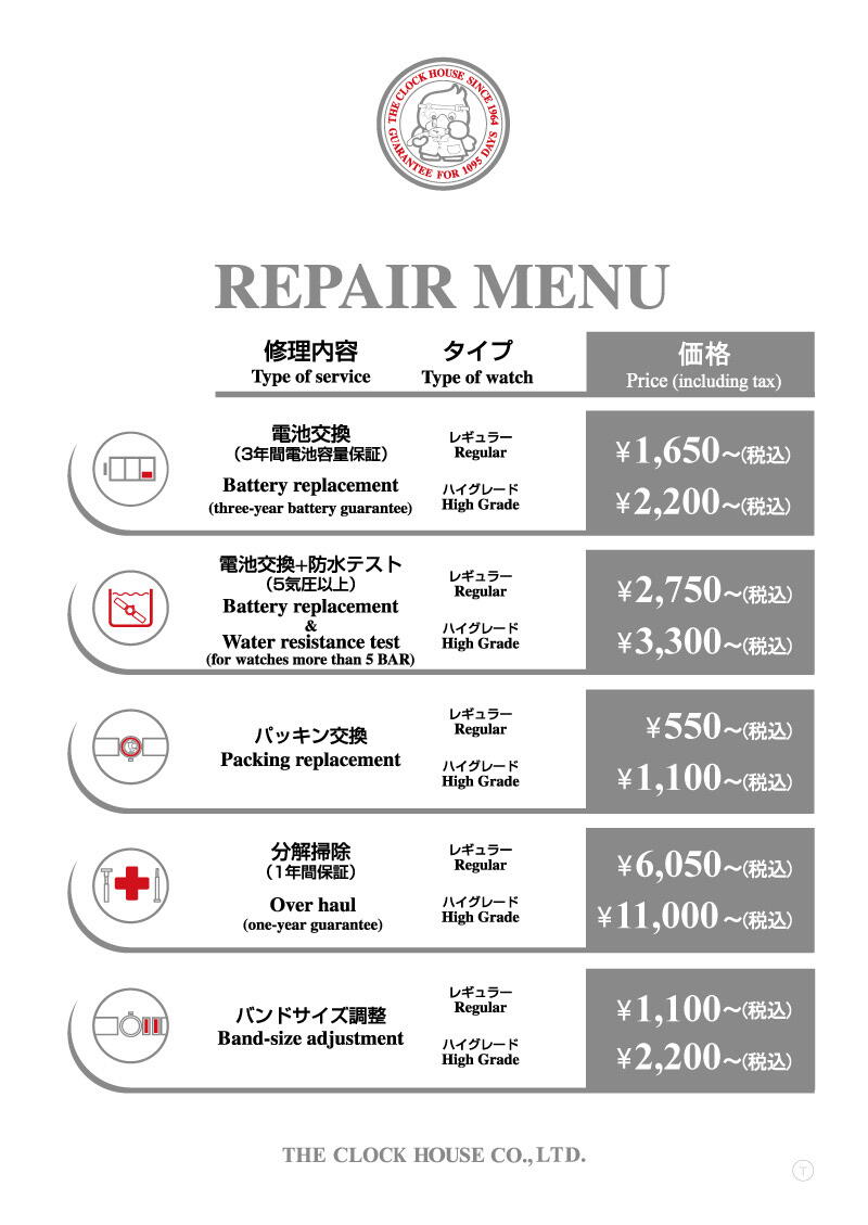 電池交換以外にも、パッキン交換やバンド交換、メタルバンドのサイズ調整なども行っております。